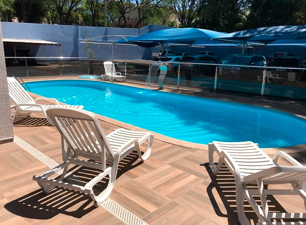 Localizada em ampla área de lazer, a piscina externa do hotel possui dois níveis de profundidade, projetada para atender crianças, adultos e pessoas com deficiência, de forma a possibilitar o lazer e a segurança necessária para todos.